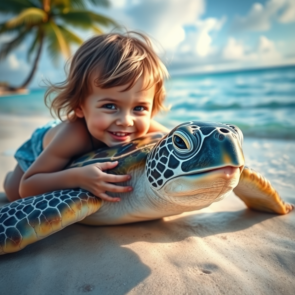 Hawaiian sea turtle on a tropical beach, captured with a photo-realistic face, in an ethereal and dreamy watercolor style inspired by Robert Wyland. The scene is highly detailed, featuring dramatic cinematic lighting and a 4k, 50mm lens signature. A child is playfully interacting with the turtle, their expression filled with wonder, in a composition blending vibrant colors and fluid brushstrokes. The overall mood is serene and enchanting, evoking a sense of natural beauty and innocence.