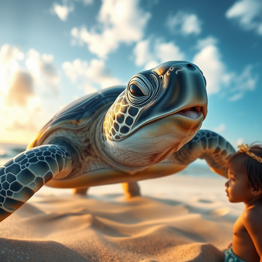 Hawaiian sea turtle on a tropical beach, capturing a photo-realistic and ethereal face, rendered in a dreamy watercolor style reminiscent of Robert Wyland, showcasing intricate details under dramatic cinematic lighting. The scene is portrayed in a stunning 4k resolution with a 50mm lens perspective, alongside a child who shares the enchanting moment, evoking a sense of wonder and tranquility. The artwork subtly integrates unconventional elements, creating a unique blend of artistic expression.