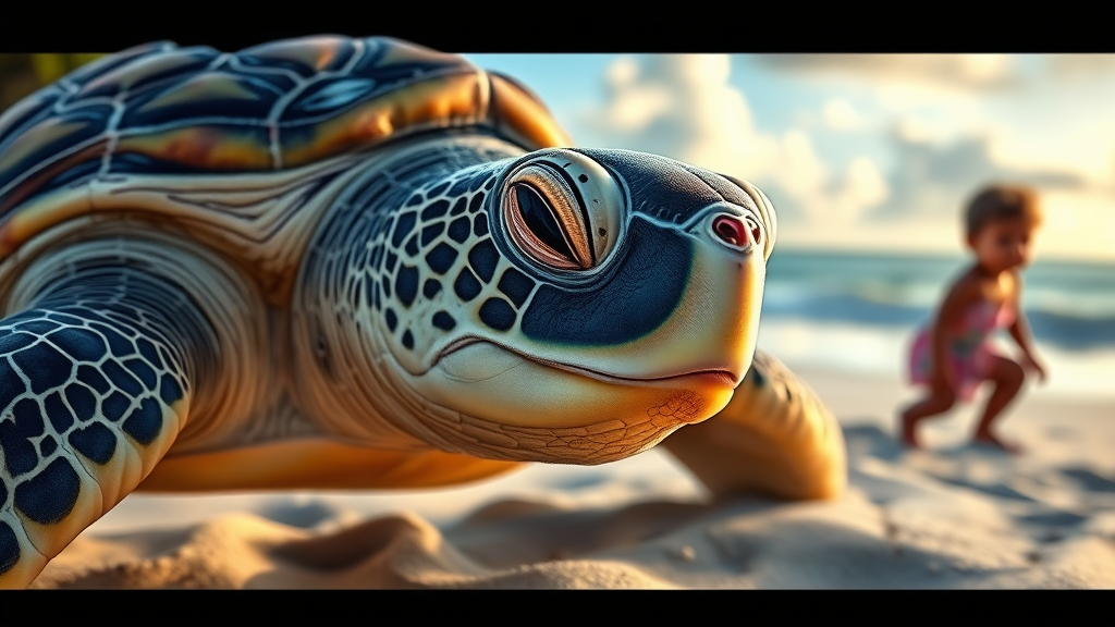 Hawaiian sea turtle on a tropical beach with a focus on a perfect photo-realistic face, rendered in an ethereal and dreamy watercolor style inspired by Robert Wyland. The scene features highly detailed elements with dramatic cinematic lighting, captured in 4k resolution using a 50mm lens signature. The setting includes a child in the background, adding a sense of wonder and innocence to the composition, while incorporating subtle, imaginative twists for a unique visual narrative.