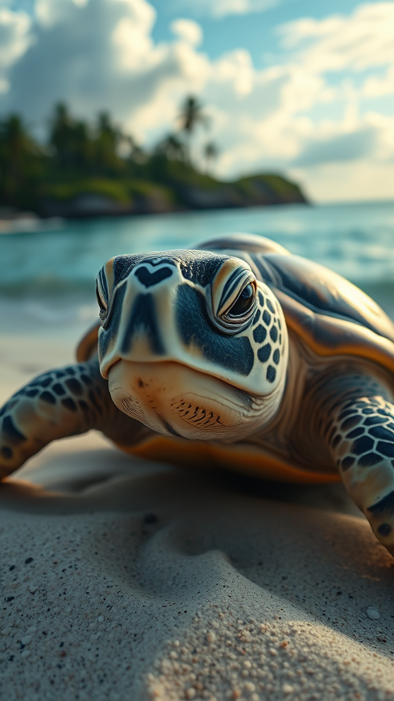 Hawaiian sea turtle on a tropical beach, with a photo-realistic face, captured in an ethereal and dreamy style reminiscent of a watercolor painting by Robert Wyland. The scene is highly detailed, with dramatic cinematic lighting that brings out the textures and colors in 4k resolution. Framed through a 50mm lens, the image conveys a sense of wonder and serenity, with subtle modifications to the environment reflecting the creative interpretation of a child-like imagination and an unconventional artistic flair.