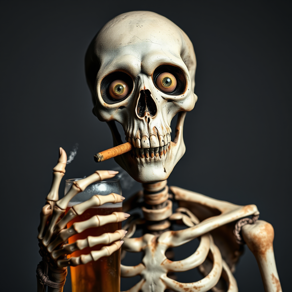 HD image of a skeleton with a cigar in its mouth, staring directly at you and gesturing in your direction while holding a beer. Features include human-like hands with flesh and skin, but with slightly mutated and extra fingers. Its eyes have deformed irises and pupils, giving it a cross-eyed appearance. The skeleton exhibits a cloned facial expression and an unusually long neck. The image quality is 16k UHD HDR, although it has elements of distortion such as low resolution, jpeg artifacts, and a cropped composition. The visual includes accidental text, a faint signature, and hints of multiple views, giving it an unpolished look. The background is simple to keep the focus on the character, with subtle imperfections adding to its eerie, imperfect charm.