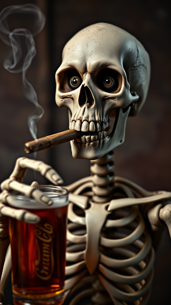 HD skeleton with a cigar in its mouth, gazing directly at you while pointing and holding a beer. The image has realistic human-like hands and skin, but features deformed irises and pupils, giving a cross-eyed effect. The skeleton has a cloned face, with extra fingers and mutated hands, adding to the uncanny appearance. The composition is somewhat cropped, with potential low-resolution elements, and minor visual imperfections like jpeg artifacts. There are no visible signatures, watermarks, or artist details. The neck is slightly elongated, and the unusual framing creates an intriguing offbeat perspective.