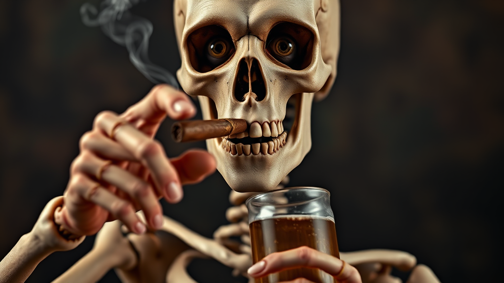 HD skeleton with a cigar in its mouth, staring directly at the viewer while pointing and holding a beer, showcasing detailed human-like hands with skin and flesh. Features include deformed iris and pupils, giving a cross-eyed appearance, and a cloned face with extra fingers on mutated hands. The image is set in 16k resolution, UHD, and HDR. The unusual appearance is accentuated by a long neck and elements like cropped framing, low resolution, distorted text, and jpeg artifacts. The overall composition avoids watermarks, signatures, usernames, artist names, or trademarks.
