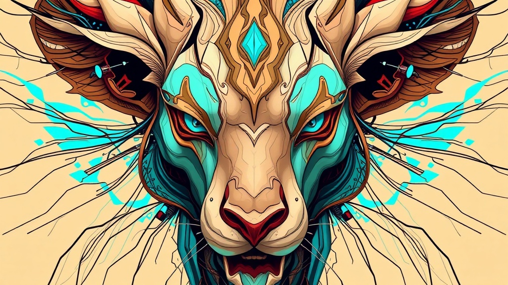 An abstract head with animallike features, vividly rendered in a futuristic cyberpunk aesthetic, showcasing intricate details and a color palette of light brown and cyan. The artwork exhibits a symmetrical balance, reminiscent of the styles of James Jean and Jeff Danziger, infused with a touch of Aykut Aydogdu’s surreal influence. Delicate textures and high stylization intertwine, forming a mesmerizing fusion of organic and mechanical elements that captivate the eye.