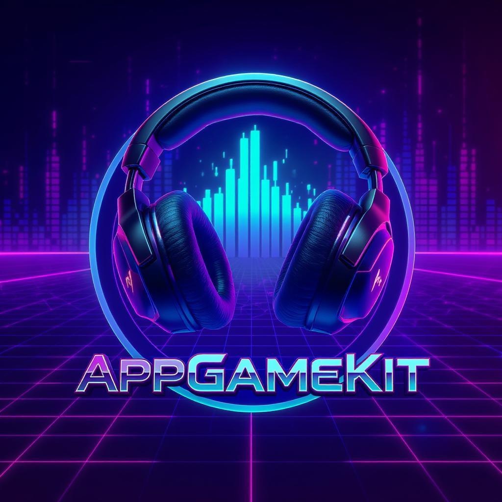 Headphones duo | gaming emblem | sleek logo | polished finish | AppGameKit vibes | vaporwave aesthetics | ultra-high-definition 16k | vibrant graphic render | enhanced audio visualizer | neo-retro design.