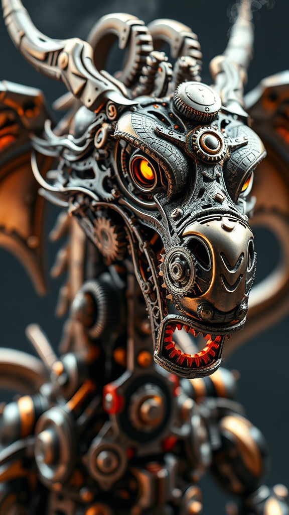 Headshot of a futuristic steampunk robotic dragon featuring intricate gears and cogs, high quality, vivid colors, trending art, popular on artstation, sharp focus resembling a studio photo, detailed metal textures, glinting scales, highly detailed, UHD clarity, HDR effects, rendered in 8K resolution with subtle glowing eyes and steam emission giving it a lifelike appearance.