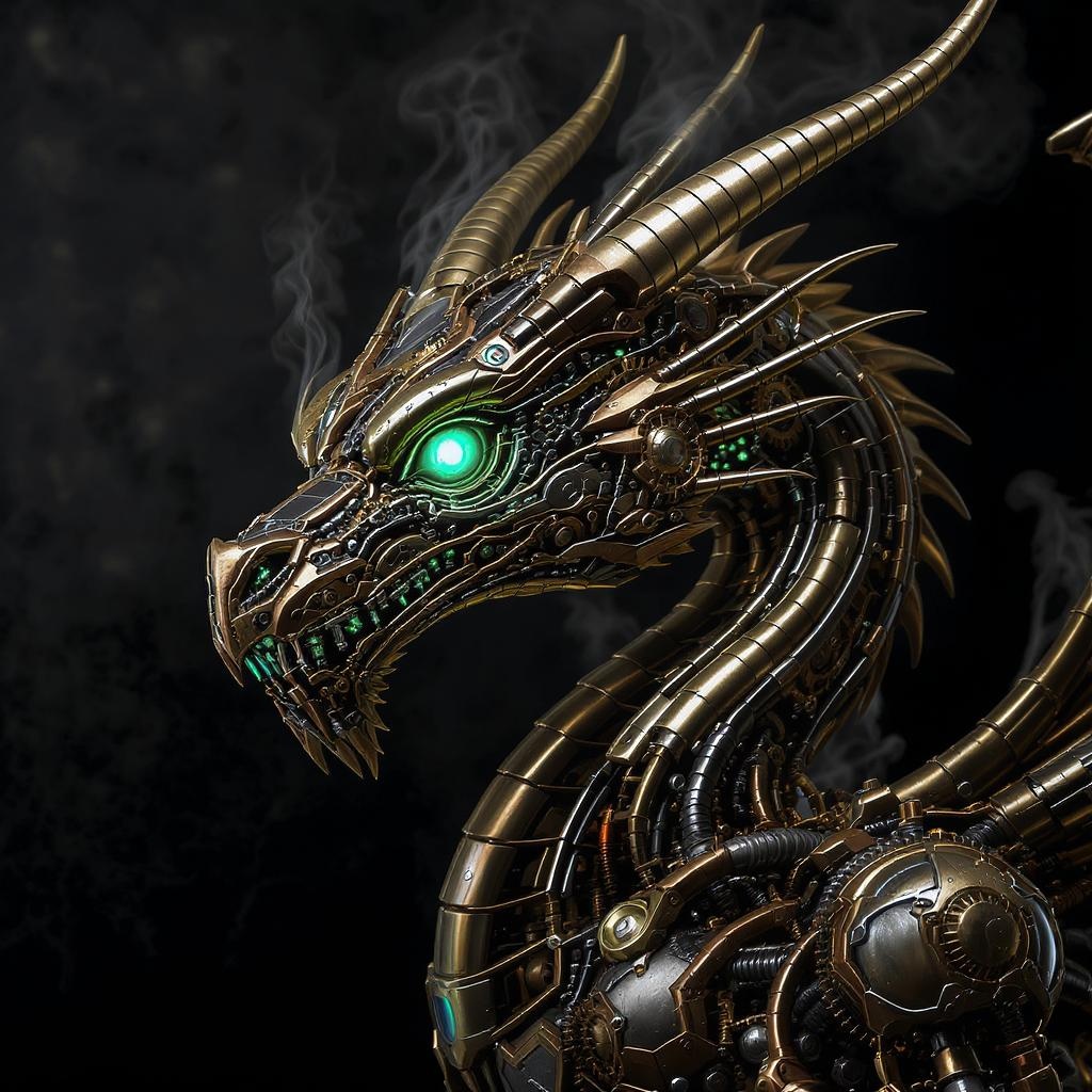 Headshot of a steampunk robotic dragon featuring intricate gears and cogs, with glowing emerald eyes and bronze scales. The scene is captured in high quality with a sharp focus, showcasing the dragon's elaborate metallic textures and polished surfaces. The design includes steam vents along its neck, exuding a slight mist to add depth. Set against a dark, textured backdrop for a studio photo effect, the image boasts highly detailed engineering and craftsmanship, rendered in UHD, HDR, 8K resolution, with a touch of Victorian elegance in ornamental detailing, making it a standout piece on art platforms.