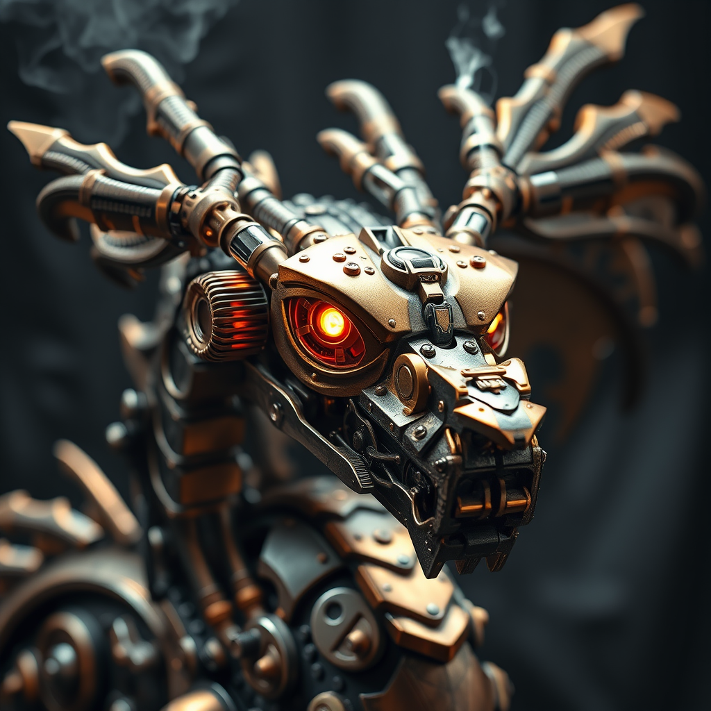 Headshot of a steampunk robotic dragon, intricately designed with industrial gears and cogs, adorned with bronze and copper plating, glowing LED eyes, highly detailed and polished surface, captured in a high-resolution 8K studio setting, vibrant HDR colors with sharp focus, subtle hints of steam and smoke adding a dynamic atmosphere, an art piece inspired by trending art styles featured on ArtStation, showcasing an elaborate fusion of fantasy and technology.