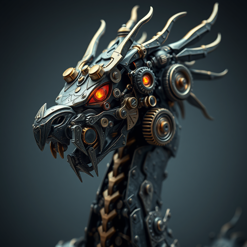 Headshot of a steampunk robotic dragon with intricate gears and brass elements, capturing the essence of both elegance and power, featuring glowing amber eyes and steam vents along its metallic scales, highly detailed and textured, trending on ArtStation, sharp focus and vibrant colors, studio photo with dramatic lighting, UHD, HDR, 8K resolution.