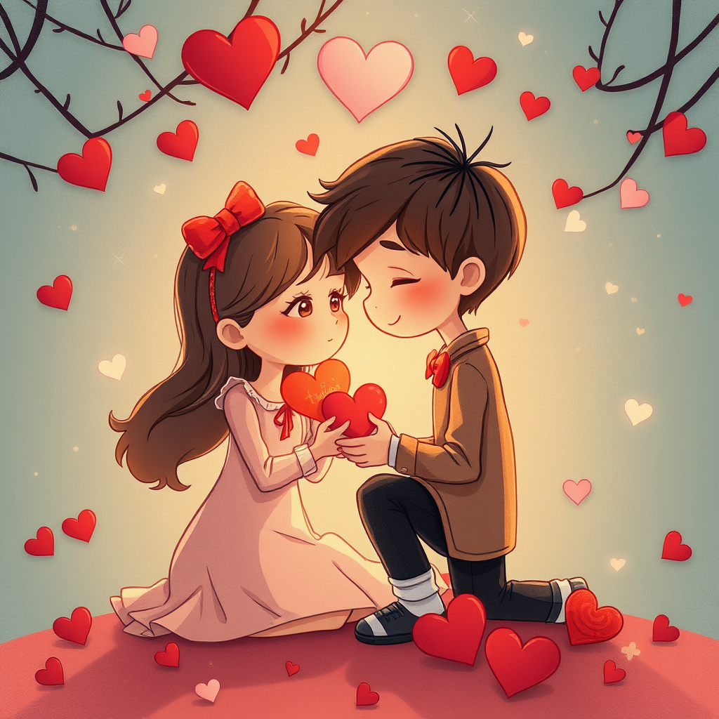Heartfelt illustration in a graphic novel-inspired style, merging the dreamy, soft touches of Fernando Amorsolo with the relatable, emotive characteristics found in Alexander Millar's work. Envision a whimsical, mesmerizing scene that is both cute and enchanting, resonating with a lit kid's imagination. This visual delight should capture the essence of a Valentine's Day narrative, rendered with a modern twist akin to Sketchfab's 3D flair, in an elongated 71:128 ratio with a stylized touch that enhances its magical, storybook appeal.