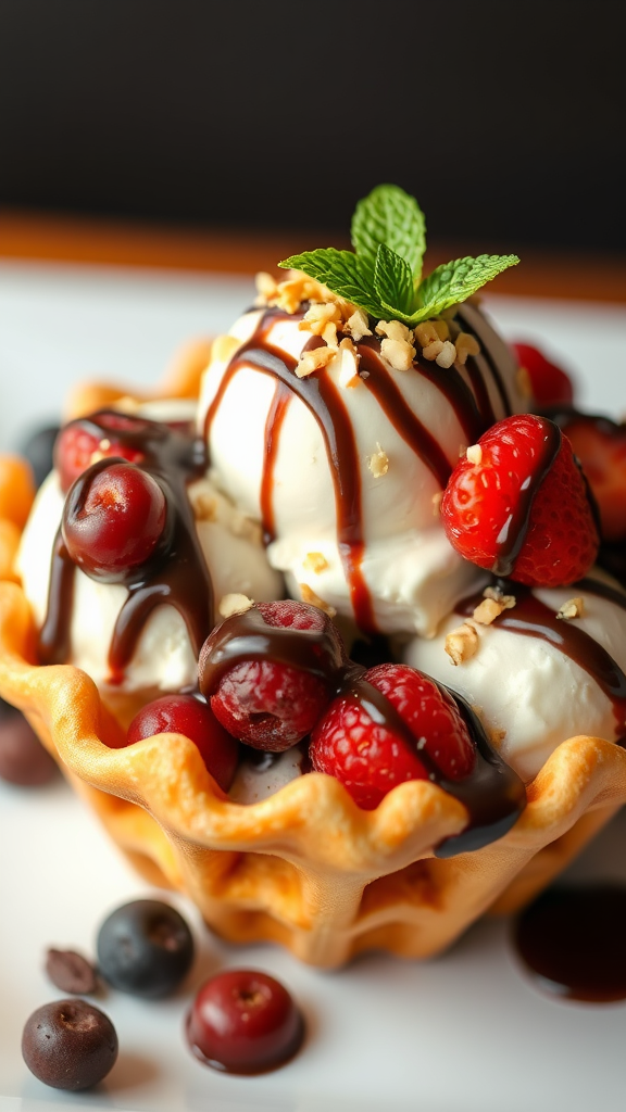 Heavenly scoops of creamy gelato nestled in a golden, crisp waffle bowl, adorned with a medley of fresh berries and a drizzle of luxurious chocolate syrup, topped with a sprinkle of crushed nuts and a hint of mint.