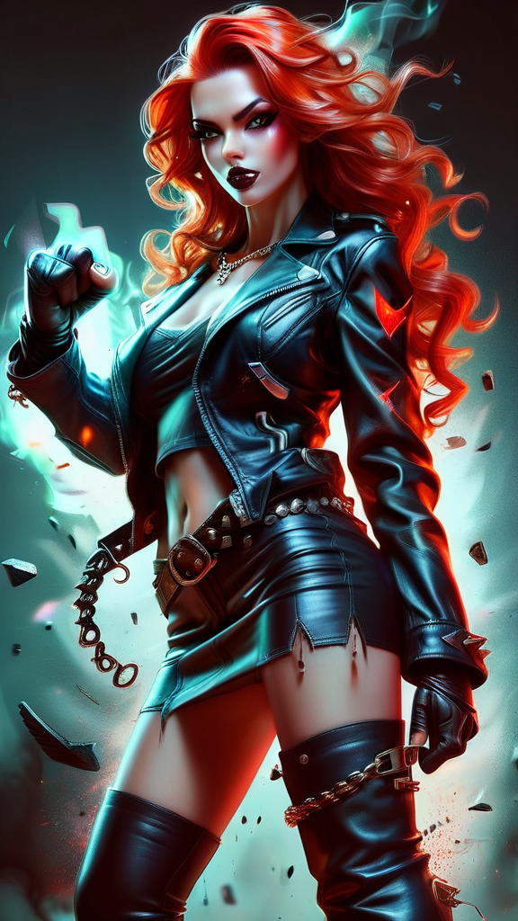 Heavy Metal biker Chick, super-hero . Feminine young woman. Long, wild flaming red hair swept back on one side, loose curls. Jade green eyes, moderate make-up, ruby red lips. Pretty, model girl, athletic, tall, busty. Black leather jacket, black spandex T-shirt, studded black leather bracelets on arms. Black leather mini-skirt, studded leather belt. Long legs, thigh high stiletto-heeled black leather boots. Red energy/fire from right hand/fist, blue energy/fire from left hand/fist. Full body pose. She always has a Harley motorcycle somewhere close by, high powered and lights on.