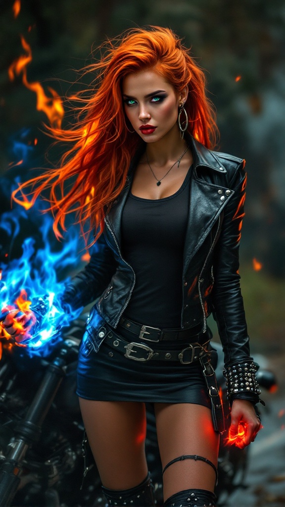 Heavy Metal, Hard Rock, motorcycles. Superhero, young woman, feminine female. Heavy Metal biker Chick that can produce blow-torch flames from her hands--- red flame from the right fist, blue flame from the left fist. Long, wild flaming red hair swept back on one side. Jade green eyes, Ruby red lips. Pretty, model girl, athletic, tall, busty. Black leather jacket, black spandex T-shirt, studded leather bracelets on arms. Black leather mini-skirt, studded leather belt. Long legs, thigh high stiletto-heeled black leather boots. Red energy/fire from right hand/fist, blue energy/fire from left hand/fist. Full body pose. She always has a Harley motorcycle somewhere close by, high powered and lights on.