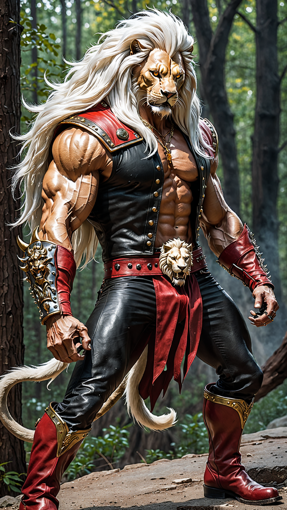 Heavy Metal, Hard Rock, Sci-Fi, superhero. A (((human))) rock star from another world with lion's eyes, a long white lion's tail, and a mane of wild white hair. Caucasian male, human man. He is really tall and strong,, and he roars loud enough to be heard blocks away. He runs at high speed, can jump really high, and has sharp claws on the ends on his fingers. Tall, strong, muscular, big muscles, wide back and chest, sinewy, narrow waist, strong powerful legs. His face is a normal human face, but he has yellow lion's eyes. Handsome manly masculine face with strong brow and jaws. His hair is a long wild mane, swept back on the sides and up in the front, some hair falling over his eyes, and thick white sudeburns. He wears a Scarlet red leather vest, open to reveal his chest. A heavy gold chain around his neck with a Leo zodiac sign pendant. Black leather bands around the tops of his biceps, and black leather bracers around his forearms. Form-fitting white tights with red claw mark designs down the sides of the legs. A heavy studded black leather belt around his waist, and knee-high red leather boots. He is a friend and Ally to all cats, and has a special affinity for wildcsts. Full body pose, probably playing an electric guitar.