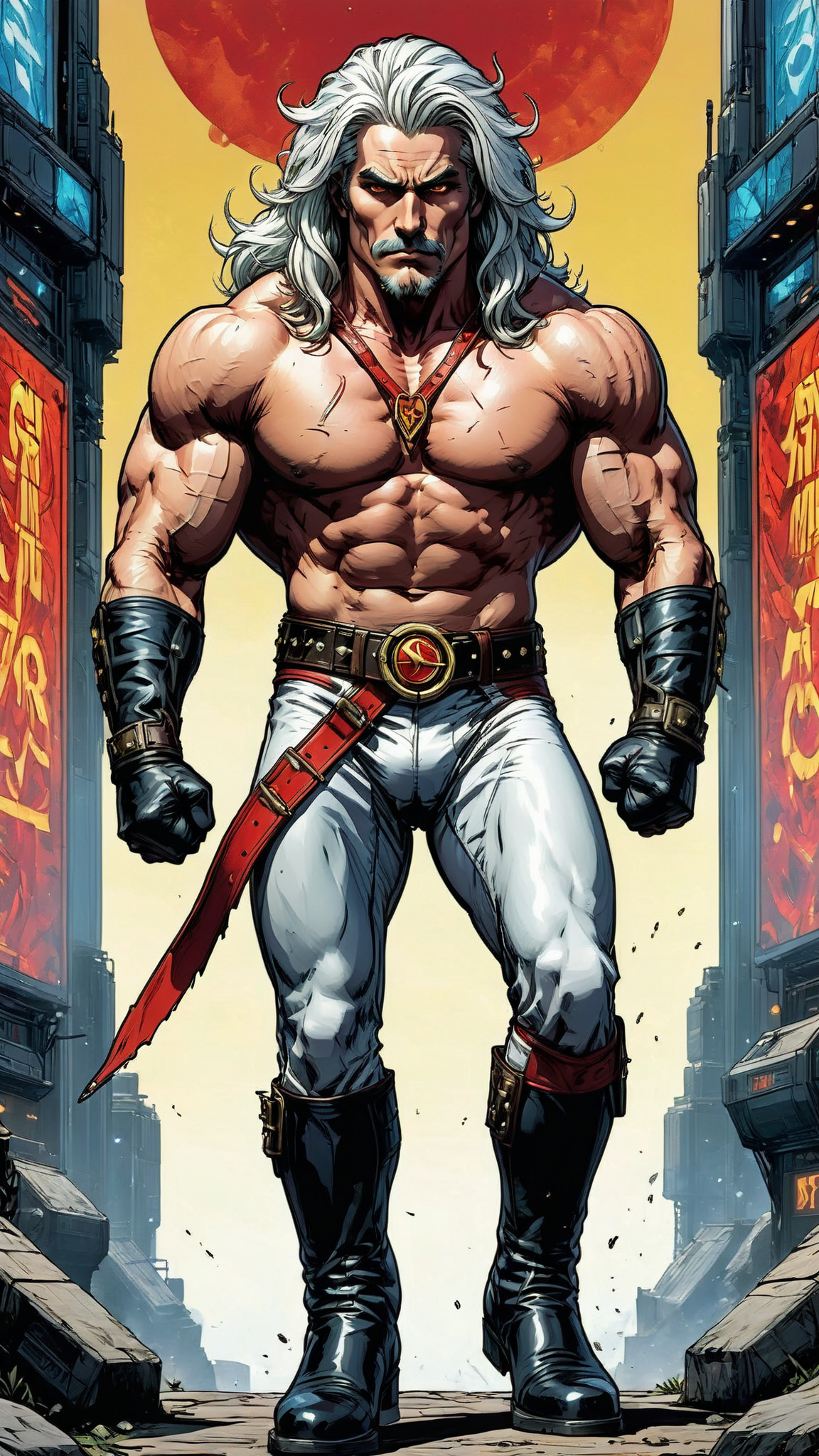 Heavy Metal, Hard Rock, Sci-Fi, superhero. A (((human))) rock star from another world with lion-like eyes, a long white lion's tail, and wild white hair. Caucasian male, human man, young man. He is really tall and strong,, and he roars loud enough to be heard blocks away. He runs at high speed, can jump really high, and has sharp claws on the ends on his fingers. Tall, strong, muscular, big muscles, wide back and chest, sinewy, narrow waist, strong powerful legs. His face is a normal human face, but he has yellow lion's eyes. Handsome manly masculine face with strong brow and jaws. A full white Beard and mustache. His hair is a long wild bob, shorter in the sides and back, longer on top, some hair falling over his eyes, and thick white sudeburns. He wears a Scarlet red leather vest, open to reveal his chest. A heavy gold chain around his neck with a Leo zodiac sign pendant. Black leather bands around the tops of his biceps, and black leather bracers around his forearms. Form-fitting white tights with red claw mark designs down the sides of the legs. A heavy studded black leather belt around his waist, and knee-high red leather boots. He is a friend and Ally to all cats, and has a special affinity for wildcsts. Full body pose, probably playing an electric guitar.