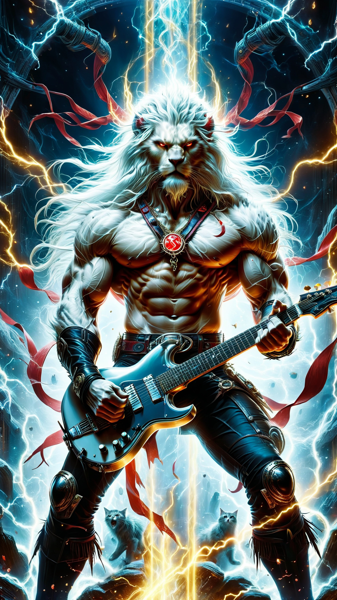 Heavy Metal, Hard Rock, Sci-Fi, superhero. A (((human))) rock star from another world with lion-like eyes, a long white lion's tail, and wild white hair. Caucasian male, human man, young man. He is really tall and strong,, and he roars loud enough to be heard blocks away. He runs at high speed, can jump really high, and has sharp claws on the ends on his fingers. Tall, strong, muscular, big muscles, wide back and chest, sinewy, narrow waist, strong powerful legs. His face is a normal human face, but he has yellow lion's eyes. Handsome manly masculine face with strong brow and jaws. A full white Beard and mustache. His hair is a long wild bob, shorter in the sides and back, longer on top, some hair falling over his eyes, and thick white sudeburns. He wears a Scarlet red leather vest, open to reveal his chest. A heavy gold chain around his neck with a Leo zodiac sign pendant. Black leather bands around the tops of his biceps, and black leather bracers around his forearms. Form-fitting white tights with red claw mark designs down the sides of the legs. A heavy studded black leather belt around his waist, and knee-high red leather boots. He is a friend and Ally to all cats, and has a special affinity for wildcsts. Full body pose, probably playing an electric guitar.
