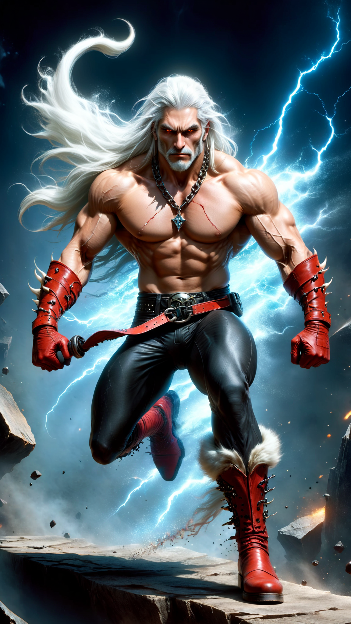 Heavy Metal, Hard Rock, Sci-Fi, superhero. A (((human))) rock star from another world with lion-like eyes, a long white lion's tail, and wild white hair. Caucasian male, human man, young man. He is really tall and strong,, and he roars loud enough to be heard blocks away. He runs at high speed, can jump really high, and has sharp claws on the ends on his fingers. Tall, strong, muscular, big muscles, wide back and chest, sinewy, narrow waist, strong powerful legs. His face is a normal human face, but he has yellow lion's eyes. Handsome manly masculine face with strong brow and jaws. A full white Beard and mustache. His hair is a long wild bob, shorter in the sides and back, longer on top, some hair falling over his eyes, and thick white sudeburns. He wears a Scarlet red leather vest, open to reveal his chest. A heavy gold chain around his neck with a Leo zodiac sign pendant. Black leather bands around the tops of his biceps, and black leather bracers around his forearms. Form-fitting white tights with red claw mark designs down the sides of the legs. A heavy studded black leather belt around his waist, and knee-high red leather boots. He is a friend and Ally to all cats, and has a special affinity for wildcsts. Full body pose, probably playing an electric guitar.