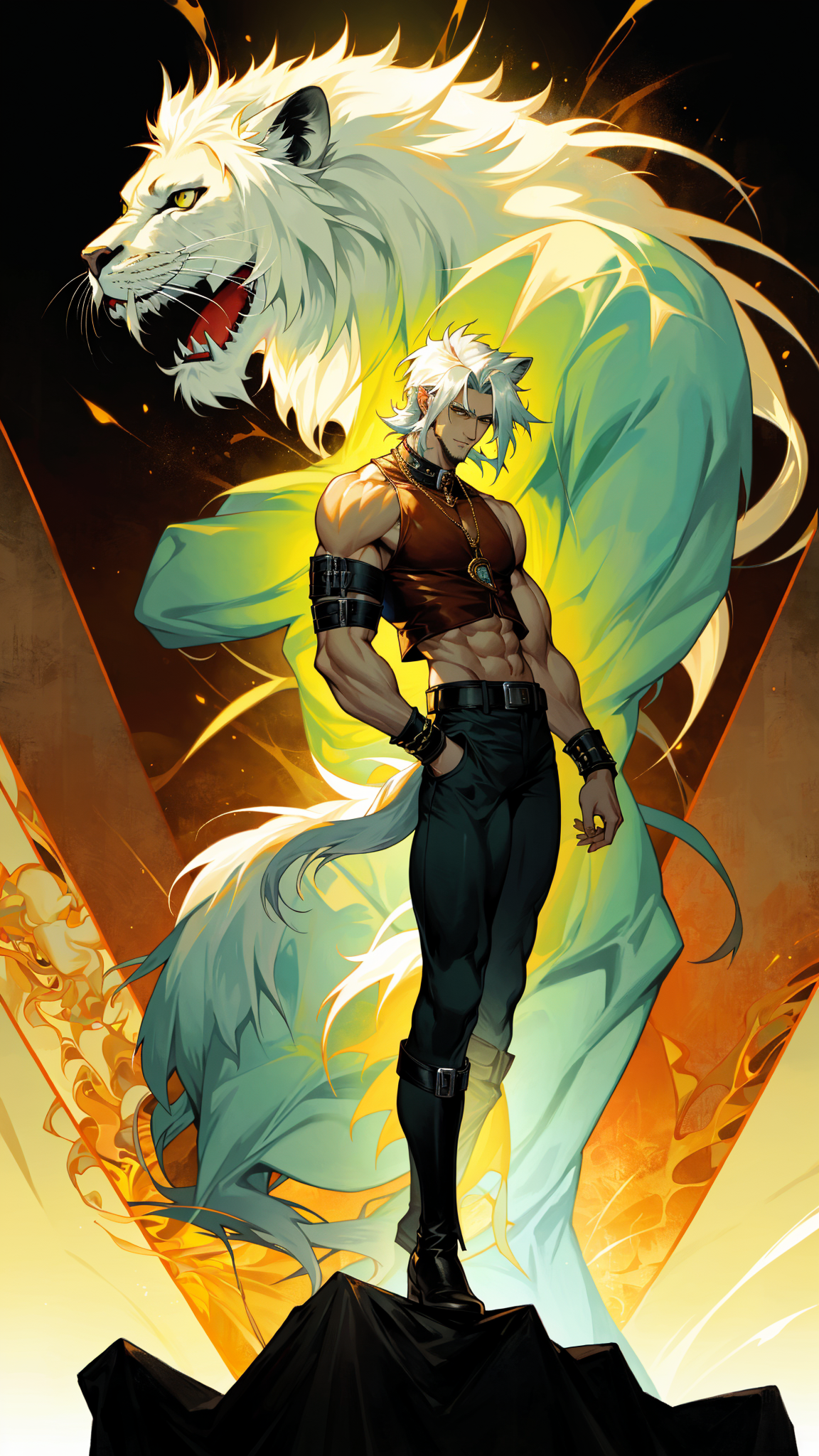 Heavy Metal, Hard Rock, Sci-Fi, superhero. A (((human))) rock star from another world with lion-like eyes, a long white lion's tail, and wild white hair. Caucasian male, human man, young man. He is really tall and strong,, and he roars loud enough to be heard blocks away. He runs at high speed, can jump really high, and has sharp claws on the ends on his fingers. Tall, strong, muscular, big muscles, wide back and chest, sinewy, narrow waist, strong powerful legs. His face is a normal human face, but he has yellow lion's eyes. Handsome manly masculine face with strong brow and jaws. A full white Beard and mustache. His hair is a long wild bob, shorter in the sides and back, longer on top, some hair falling over his eyes, and thick white sudeburns. He wears a Scarlet red leather vest, open to reveal his chest. A heavy gold chain around his neck with a Leo zodiac sign pendant. Black leather bands around the tops of his biceps, and black leather bracers around his forearms. Form-fitting white tights with red claw mark designs down the sides of the legs. A heavy studded black leather belt around his waist, and knee-high red leather boots. He is a friend and Ally to all cats, and has a special affinity for wildcsts. Full body pose, probably playing an electric guitar.