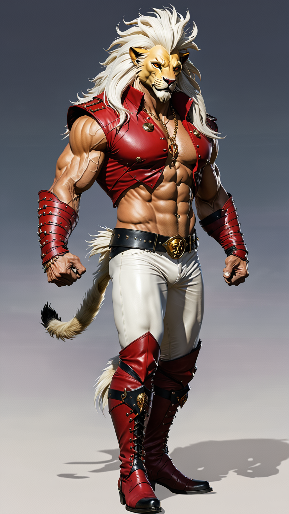 Heavy Metal, Hard Rock, Sci-Fi, Thundercats, superhero. A human rock star from another world with lion-like features like lion's eyes, a long white lion's tail, and a mane of wild white hair. Caucasian male. He is really tall and strong,, and he roars loud enough to be heard blocks away. He runs at high speed, can jump really high, and has sharp claws on the ends on his fingers. Tall, strong, muscular, big muscles, wide back and chest, sinewy, narrow waist, strong powerful legs. His face is human, but he has yellow lion's eyes. Handsome manly masculine face with strong brow and jaws. His hair is a long wild mane, swept back on the sides and up in the front, some hair falling over his eyes, and thick white sudeburns. He wears a Scarlet red leather vest, open to reveal his chest. A heavy gold chain around his neck with a Leo zodiac sign pendant. Black leather bands around the tops of his biceps, and black leather bracers around his forearms. Form-fitting white tights with red claw mark designs down the sides of the legs. A heavy studded black leather belt around his waist, and knee-high red leather boots. He is a friend and Ally to all cats, and has a special affinity for wildcsts, especially lions. Full body pose, probably playing an electric guitar.