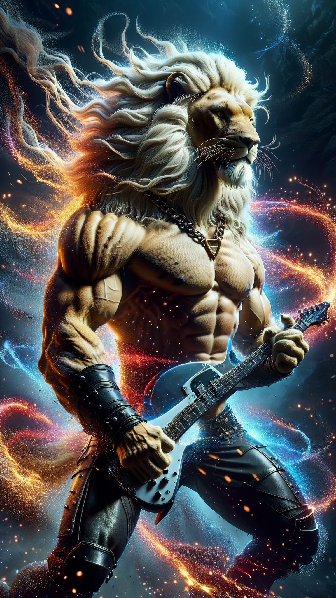 Heavy Metal, Hard Rock, Sci-Fi, Thundercats, superhero. A human rock star from another world with lion-like features like lion's eyes, a long white lion's tail, and a mane of wild white hair. Caucasian male. He is really tall and strong,, and he roars loud enough to be heard blocks away. He runs at high speed, can jump really high, and has sharp claws on the ends on his fingers. Tall, strong, muscular, big muscles, wide back and chest, sinewy, narrow waist, strong powerful legs. His face is human, but he has yellow lion's eyes. Handsome manly masculine face with strong brow and jaws. His hair is a long wild mane, swept back on the sides and up in the front, some hair falling over his eyes, and thick white sudeburns. He wears a Scarlet red leather vest, open to reveal his chest. A heavy gold chain around his neck with a Leo zodiac sign pendant. Black leather bands around the tops of his biceps, and black leather bracers around his forearms. Form-fitting white tights with red claw mark designs down the sides of the legs. A heavy studded black leather belt around his waist, and knee-high red leather boots. He is a friend and Ally to all cats, and has a special affinity for wildcsts, especially lions. Full body pose, probably playing an electric guitar.