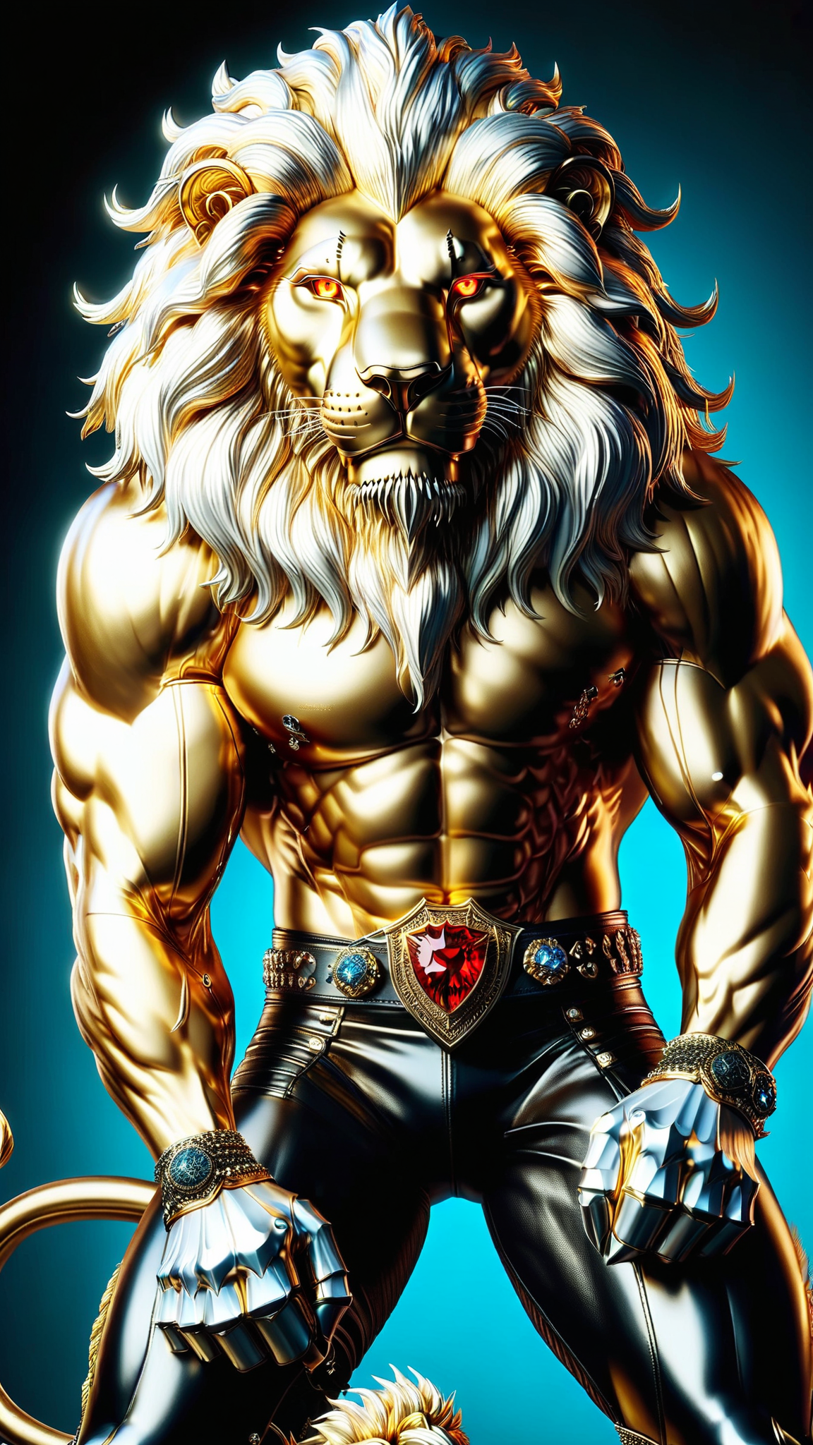 Heavy Metal, Hard Rock, Sci-Fi, Thundercats, superhero. A human rock star from another world with lion-like features like lion's eyes, a long white lion's tail, and a mane of wild white hair. Caucasian male. He is really tall and strong,, and he roars loud enough to be heard blocks away. He runs at high speed, can jump really high, and has sharp claws on the ends on his fingers. Tall, strong, muscular, big muscles, wide back and chest, sinewy, narrow waist, strong powerful legs. His face is human, but he has yellow lion's eyes. Handsome manly masculine face with strong brow and jaws. His hair is a long wild mane, swept back on the sides and up in the front, some hair falling over his eyes, and thick white sudeburns. He wears a Scarlet red leather vest, open to reveal his chest. A heavy gold chain around his neck with a Leo zodiac sign pendant. Black leather bands around the tops of his biceps, and black leather bracers around his forearms. Form-fitting white tights with red claw mark designs down the sides of the legs. A heavy studded black leather belt around his waist, and knee-high red leather boots. He is a friend and Ally to all cats, and has a special affinity for wildcsts, especially lions. Full body pose, probably playing an electric guitar.