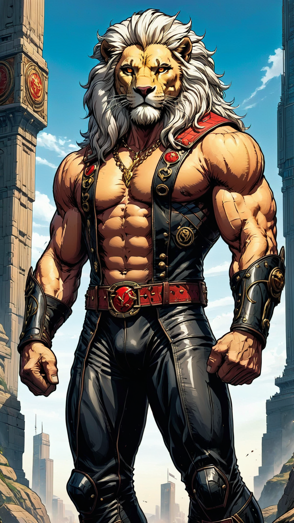 Heavy Metal, Hard Rock, Sci-Fi, Thundercats, superhero. A human rock star from another world with lion-like features like lion's eyes, a long white lion's tail, and a mane of wild white hair. Caucasian male. He is really tall and strong,, and he roars loud enough to be heard blocks away. He runs at high speed, can jump really high, and has sharp claws on the ends on his fingers. Tall, strong, muscular, big muscles, wide back and chest, sinewy, narrow waist, strong powerful legs. His face is human, but he has yellow lion's eyes. Handsome manly masculine face with strong brow and jaws. His hair is a long wild mane, swept back on the sides and up in the front, some hair falling over his eyes, and thick white sudeburns. He wears a Scarlet red leather vest, open to reveal his chest. A heavy gold chain around his neck with a Leo zodiac sign pendant. Black leather bands around the tops of his biceps, and black leather bracers around his forearms. Form-fitting white tights with red claw mark designs down the sides of the legs. A heavy studded black leather belt around his waist, and knee-high red leather boots. He is a friend and Ally to all cats, and has a special affinity for wildcsts, especially lions. Full body pose, probably playing an electric guitar.