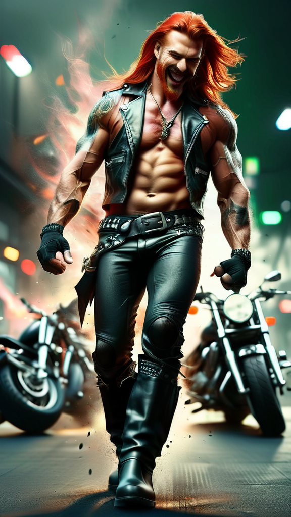 Heavy Metal/Hard Rock, motorcycles. Male motorcycle/biker gang member. Mature man, sexy, attractive, virile. Handsome face, strong brow and jaw, thin red goatee, jade green eyes. Surly grin. Hypermasculine, manly, very tall, muscular, big muscled, sinewy, broad chest, narrow waist, big biceps. Long wild locks of flaming red hair, side parted. Slightly hairy chest, tattoos on arms and chest. Black leather vest, open and exposing chest. Black leather pants and boots, studded belt around waist. Leaning back, legs open, huge crotch. Full body pose.