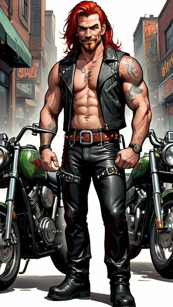 Heavy Metal/Hard Rock, motorcycles. Male motorcycle/biker gang member. Mature man, sexy, attractive, virile. Handsome face, strong brow and jaw, thin red goatee, jade green eyes. Surly grin. Hypermasculine, manly, very tall, muscular, big muscled, sinewy, broad chest, narrow waist, big biceps. Long wild locks of flaming red hair, side parted. Slightly hairy chest, tattoos on arms and chest. Black leather vest, open and exposing chest. Black leather pants and boots, studded belt around waist. Leaning back, legs open, huge crotch. Full body pose.