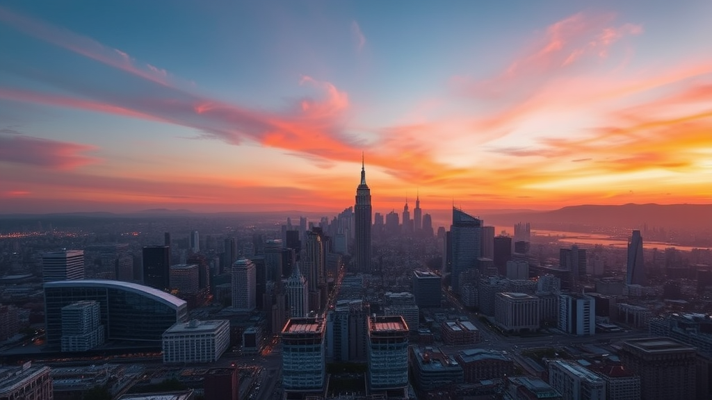 Heico skyline at twilight, vibrant hues painting the sky, intricate cityscape in 9:18 aspect ratio, soft shadows with a touch of mystery, engaging a sense of wonder and exploration, abstract elements blending seamlessly with urban features, gentle balance between realism and surrealism, capturing the essence of an ever-evolving metropolis.