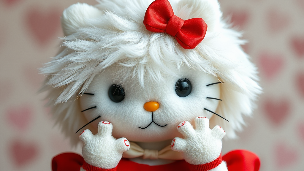 Hello Kitty as a human, with fluffy white hair, adorned with red bows. Inspired by a charming mix of cute and quirky anatomy, featuring playful imperfections like unusual hands with missing or extra fingers. The scene is reminiscent of an artistic glitch, embodying textures that range from low to normal quality, with gentle hints of jpeg artifacts. Visual elements may include subtle signatures or watermarks, adding to the character's unique aura. This creative depiction embraces a whimsical blend of fantasy, capturing the essence of Hello Kitty in a world where imagination reigns supreme.