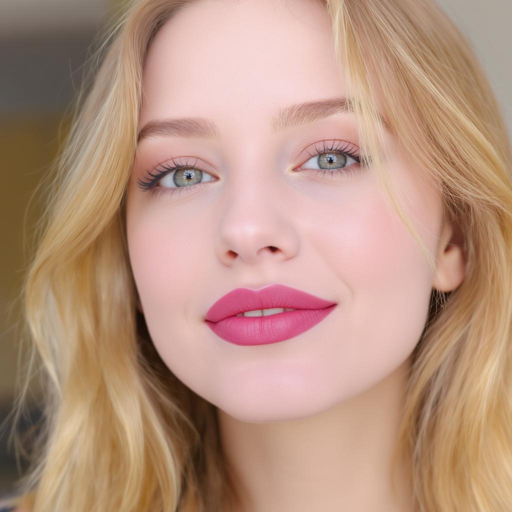 Her delicate nose has a slight upturn, reminiscent of a charming button shape. Her lush, full lips possess a natural pink hue that beautifully contrasts with her porcelain complexion. Gently parted in a serene smile, they suggest she is immersed in her thoughts or perhaps entranced by the surrounding beauty.