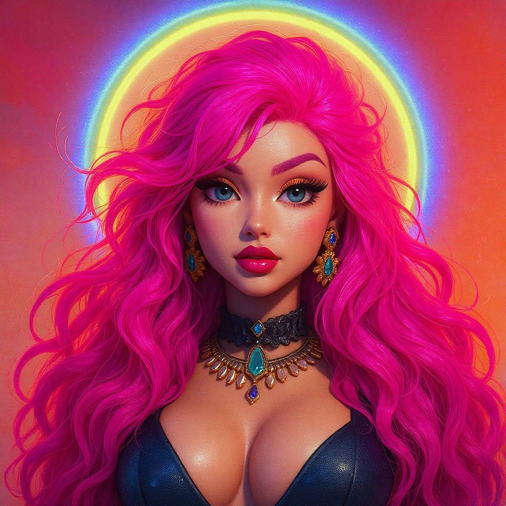 Her hair, a chaotic burst of vivid pink, cascades in untamed waves that defy description, forming a colorful halo around her face. Adorned with bold jewelry and boasting a voluptuous figure, she appears as a striking fusion of CGI and 3D artistry. The long hair complements her anime-like features, reminiscent of a beautifully crafted doll. This digital illustration, rendered with octane precision, captures a whimsical blend of cartoon and digital painting aesthetics, creating an engaging low-res visual narrative.