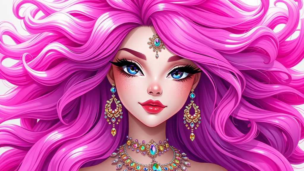 Her hair cascades in a vibrant explosion of pink, an extraordinary hue that transcends words. It tumbles in wild, unrestrained waves, encircling her face in a radiant aura of color. Adorned with dazzling jewelry, her ample curves are accentuated. Depicted with long tresses, she embodies a CGI marvel, a 3D rendered doll blending elements of cartoon and anime. This illustration captures the essence of digital art, painted with care, even in low resolution, portraying her striking presence with minimal text.