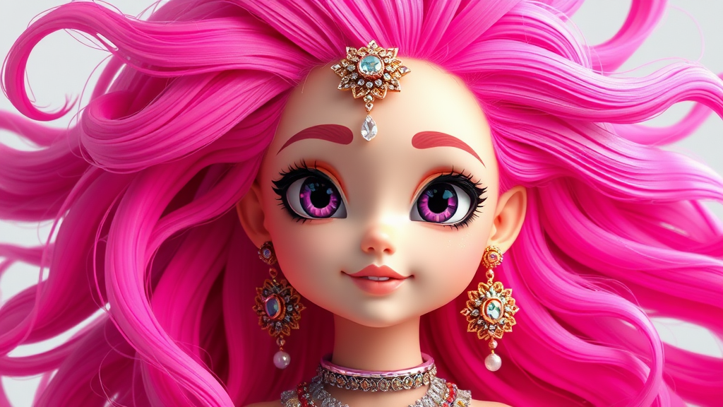 Her hair cascades wildly in a vibrant pink hue that challenges the imagination, framing her face with untamed waves like a colorful halo. Adorned with intricate jewelry, her features are striking, highlighted by her animated expression. Her figure is accentuated with defined curves and the detailed design of a richly textured doll. Rendered in CGI with the smooth aesthetics of a cartoon or anime, this digital illustration captures the essence of a 3D model, blending elements of drawing and painting. Despite its low resolution, the artwork is vivid and compelling, overflowing with a playful, imaginative spirit.