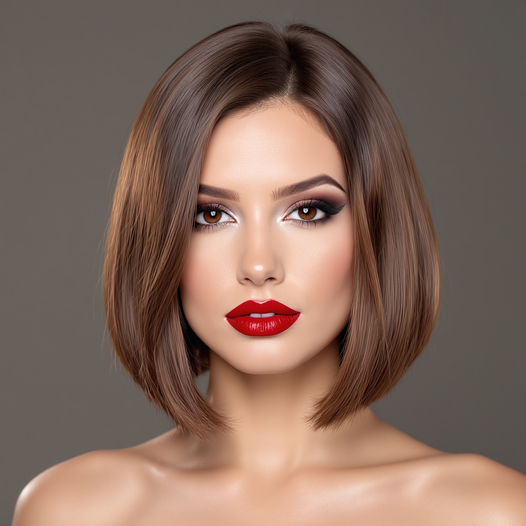 View this AI-generated image featuring her hair features a sleek contemporary bob that grazes just above her shoulders a luxurious chestnut hue enhanced with delicate highlights that shimmer subtly giving her locks extra depth the woman s makeup is impeccable showcasing a refined smoky eye paired wi