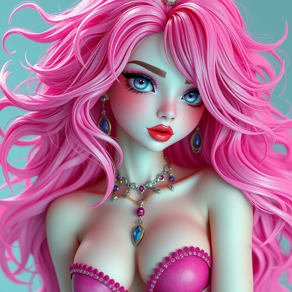 Her hair is a cascade of vibrant pink, a striking hue that challenges the norm. It spills in untamed cascades around her face, enveloping her features in a colorful aura. adorned with jewelry, she has a busty figure, and her long hair is reminiscent of CGI and 3D art. her appearance is akin to a doll, crafted with octane rendering, blending elements of cartoon and anime. the scene captures the essence of illustration and digital painting, a fusion of low-resolution charm and textual whimsy.