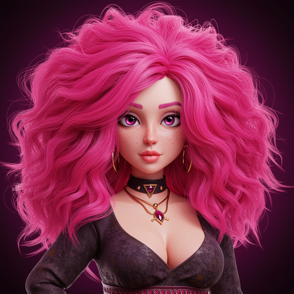 Her hair is a cascade of vibrant pink, an electrifying hue that seems almost beyond words. It tumbles in carefree, unruly waves around her face, encircling her features in a vivid halo. Adorned with striking jewelry, she possesses an exaggerated, curvaceous form, accentuated by her flowing locks. This CGI-inspired 3D creation resembles a doll, brought to life through expert rendering techniques. The style blends elements of cartoon and anime, resulting in a captivating illustration. Despite its digital art origin, the piece evokes the feel of a hand-drawn painting. Low resolution text hints at a story waiting to be told.