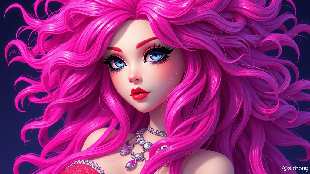Her hair is a chaotic symphony of vibrant pink, an electric hue that almost seems indescribable. It cascades in unrestrained, flowing waves around her face, creating a colorful halo that highlights her features. Adorned with striking jewelry, she possesses a voluptuous figure, emphasized by her lush, long locks. The scene evokes the style of a CGI-rendered doll, reminiscent of a rich 3D animation with cartoonish charm. The artwork blends the aesthetic of anime with a touch of digital illustration, resulting in a captivating low-resolution digital painting. Text elements weave subtly through the vivid imagery, enhancing the visual narrative.