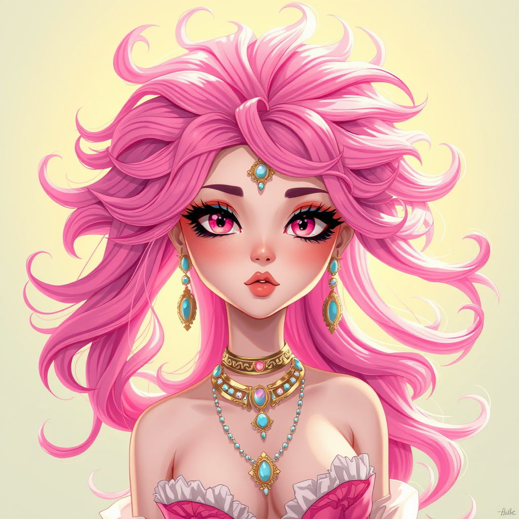 Her hair is an explosion of vibrant pink, cascading in wild waves that embrace her face in a radiant halo. Adorned with striking jewelry, she has captivating features and a voluptuous figure. Imagined as a blend of CGI and 3D craftsmanship, her appearance is reminiscent of a delicate doll, brought to life with the finesse of octane rendering. This cartoon-inspired anime illustration merges digital painting techniques with a charming low-res aesthetic, creating a vivid tapestry without the use of text.
