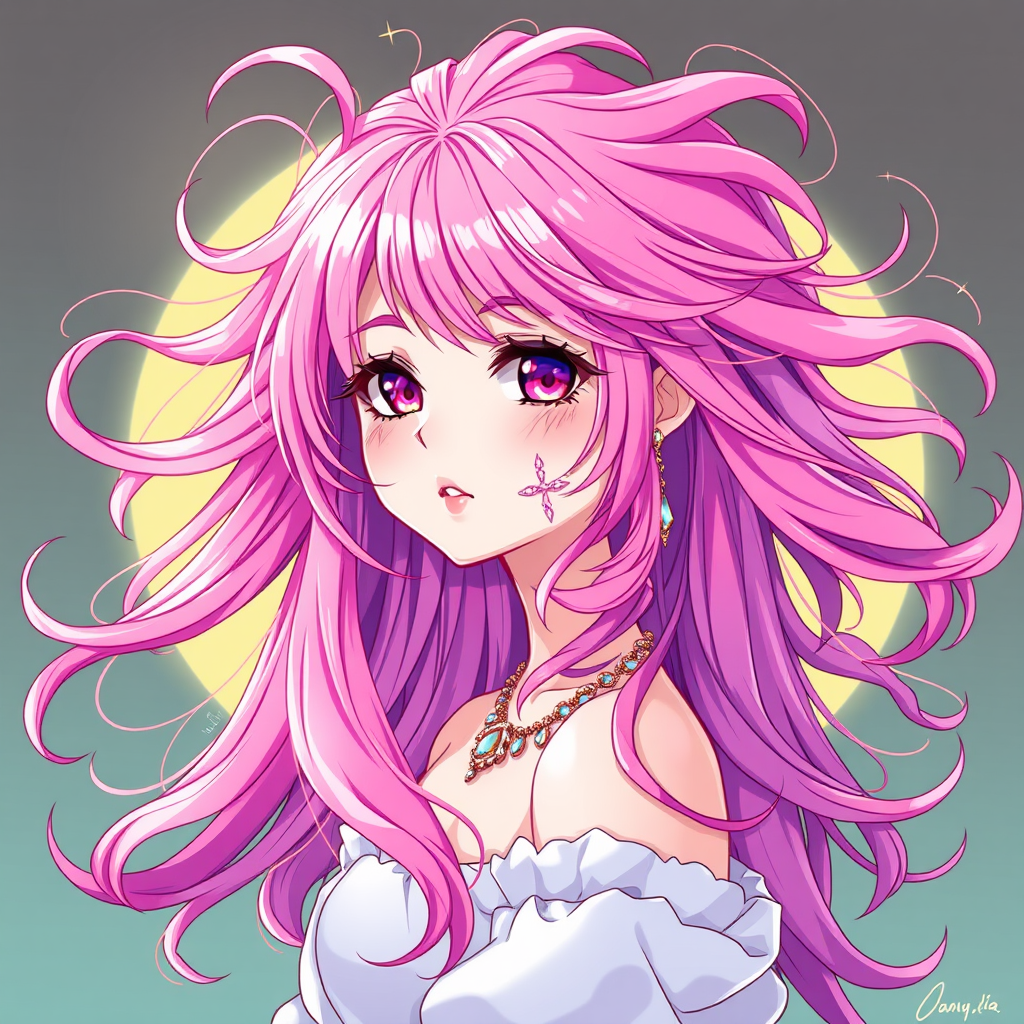 Her hair spills in vibrant, uncontainable pink waves, a dazzling hue beyond words, cascading chaotically around her face and surrounding her features in a radiant halo. Gleaming jewelry accents her look, highlighting her full figure. Her long hair flows like a CGI marvel, reminiscent of a 3D-rendered doll. This cartoon-like anime illustration captures the essence of digital artistry, blending drawing with a painterly touch, evoking low-res nostalgia with elegantly integrated text elements.