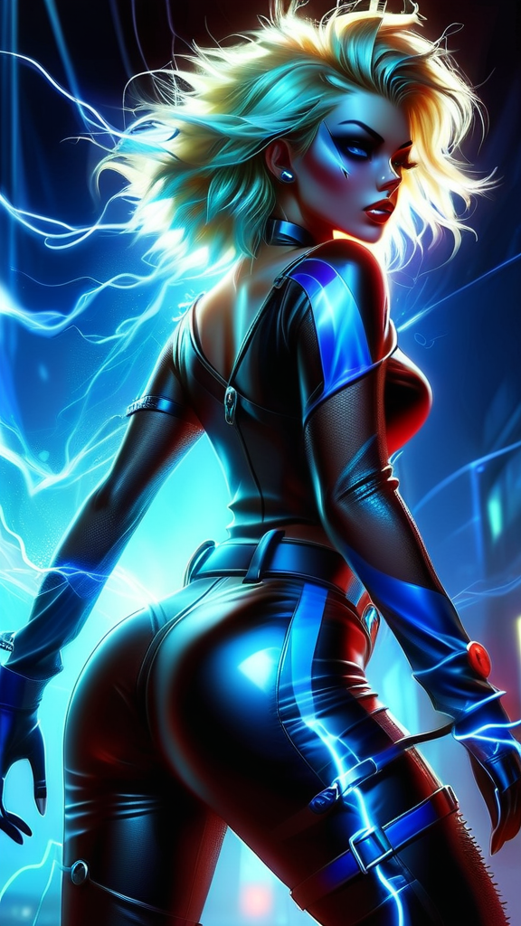 Her name is Electric Blue. Super-hero. That perfect cross between supermodel and punk rock. Feminine Caucasian female, young woman in her early 20s. Tall, athletic, thin but curvy, strong. Curly-spiky blonde Bob hairstyle with fluffy Bangs swept over one eye, a neon-blue streak of hair in the front. Pretty model face with long blonde lashes and electric blue eyes, glowing neon bright eyes. Punk Rock eye make-up in various shades of blue. Shiny glossy cherry-red lips. Her uniform is a spandex form-fitting cobalt blue with glowing neon blue glyphs/stripes on the fabric, top and pants. A shiny metallic chrome belt that curves downwards on her waist. Mid-calf black leather boots with high heels and silver grommets. She can produce bright blue electricity/lightning from her hands and fire a stream of it at her opponents. She can also shock her enemies if needed. She can also become pure electricity and use it to travel along power lines and grids and incredible speeds.