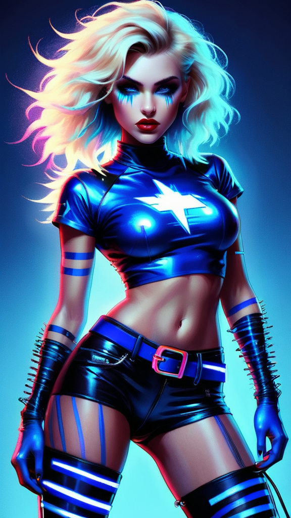Her name is Electric Blue. Super-hero. That perfect cross between supermodel and punk rock. Feminine Caucasian female, young woman in her early 20s. Tall, athletic, thin but curvy, strong. Curly-spiky blonde Bob hairstyle with fluffy Bangs swept over one eye, a neon-blue streak of hair in the front. Pretty model face with long blonde lashes and electric blue eyes, glowing neon bright eyes. Punk Rock eye make-up in various shades of blue. Shiny glossy cherry-red lips. Her uniform is a spandex form-fitting cobalt blue with glowing neon blue glyphs/stripes on the fabric, top and pants. A shiny metallic chrome belt that curves downwards on her waist. Mid-calf black leather boots with high heels and silver grommets. She can produce bright blue electricity/lightning from her hands and fire a stream of it at her opponents. She can also shock her enemies if needed. She can also become pure electricity and use it to travel along power lines and grids and incredible speeds.