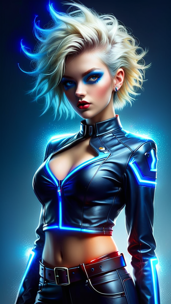Her name is Electric Blue. Super-hero. That perfect cross between supermodel and punk rock. Feminine Caucasian female, young woman in her early 20s. Tall, athletic, thin but curvy, strong. Curly-spiky blonde Bob hairstyle with fluffy Bangs swept over one eye, a neon-blue streak of hair in the front. Pretty model face with long blonde lashes and electric blue eyes, glowing neon bright eyes. Punk Rock eye make-up in various shades of blue. Shiny glossy cherry-red lips. Her uniform is a spandex form-fitting cobalt blue with glowing neon blue glyphs/stripes on the fabric, top and pants. A shiny metallic chrome belt that curves downwards on her waist. Mid-calf black leather boots with high heels and silver grommets. She can produce bright blue electricity/lightning from her hands and fire a stream of it at her opponents. She can also shock her enemies if needed. She can also become pure electricity and use it to travel along power lines and grids and incredible speeds.