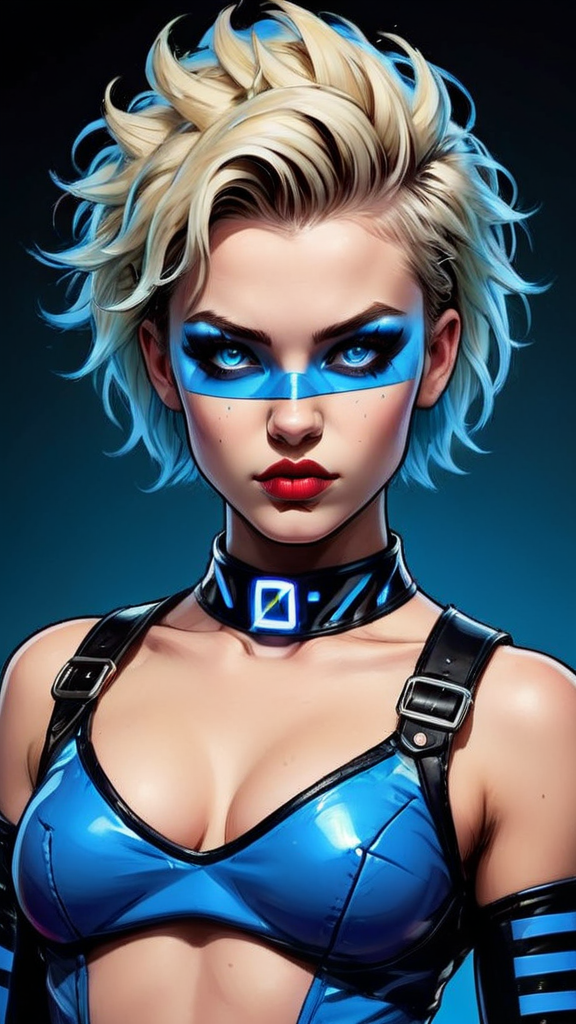 Her name is Electric Blue. Super-hero. That perfect cross between supermodel and punk rock. Feminine Caucasian female, young woman in her early 20s. Tall, athletic, thin but curvy, strong. Curly-spiky blonde Bob hairstyle with fluffy Bangs swept over one eye, a neon-blue streak of hair in the front. Pretty model face with long blonde lashes and electric blue eyes, glowing neon bright eyes. Punk Rock eye make-up in various shades of blue. Shiny glossy cherry-red lips. Her uniform is a spandex form-fitting cobalt blue with glowing neon blue glyphs/stripes on the fabric, top and pants. A shiny metallic chrome belt that curves downwards on her waist. Mid-calf black leather boots with high heels and silver grommets. She can produce bright blue electricity/lightning from her hands and fire a stream of it at her opponents. She can also shock her enemies if needed. She can also become pure electricity and use it to travel along power lines and grids and incredible speeds.