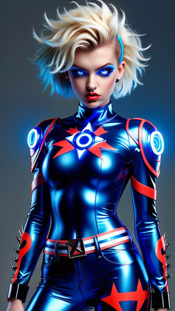 Her name is Electric Blue. Super-hero. That perfect cross between supermodel and punk rock. Feminine Caucasian female, young woman in her early 20s. Tall, athletic, thin but curvy, strong. Curly-spiky blonde Bob hairstyle with fluffy Bangs swept over one eye, a neon-blue streak of hair in the front. Pretty model face with long blonde lashes and electric blue eyes, glowing neon bright eyes. Punk Rock eye make-up in various shades of blue. Shiny glossy cherry-red lips. Her uniform is a spandex form-fitting cobalt blue with glowing neon blue glyphs/stripes on the fabric, top and pants. A shiny metallic chrome belt that curves downwards on her waist. Mid-calf black leather boots with high heels and silver grommets. She can produce bright blue electricity/lightning from her hands and fire a stream of it at her opponents. She can also shock her enemies if needed. She can also become pure electricity and use it to travel along power lines and grids and incredible speeds.