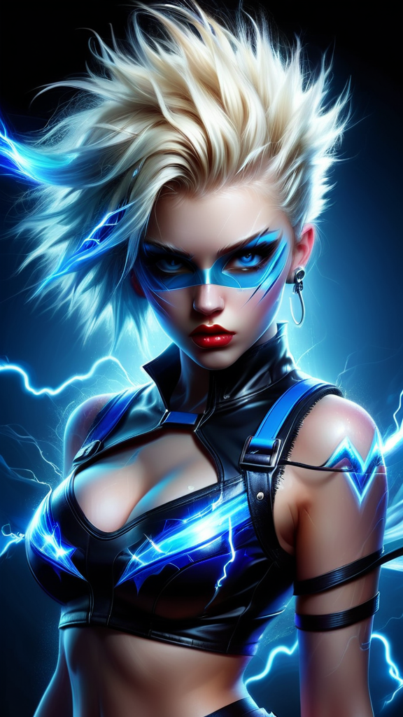 Her name is Electric Blue. Super-hero. That perfect cross between supermodel and punk rock. Feminine Caucasian female, young woman in her early 20s. Tall, athletic, thin but curvy, strong. Curly-spiky blonde Bob hairstyle with fluffy Bangs swept over one eye, a neon-blue streak of hair in the front. Pretty model face with long blonde lashes and electric blue eyes, glowing neon bright eyes. Punk Rock eye make-up in various shades of blue. Shiny glossy cherry-red lips. Her uniform is a spandex form-fitting cobalt blue with glowing neon blue glyphs/stripes on the fabric, top and pants. A shiny metallic chrome belt that curves downwards on her waist. Mid-calf black leather boots with high heels and silver grommets. She can produce bright blue electricity/lightning from her hands and fire a stream of it at her opponents. She can also shock her enemies if needed. She can also become pure electricity and use it to travel along power lines and grids and incredible speeds.