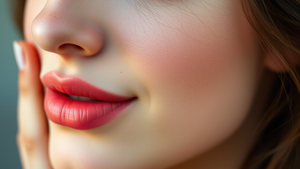 Her nose is dainty and slightly upturned, reminiscent of a button shape. Her lips are full and luscious, with a natural pink hue that beautifully contrasts her porcelain complexion. They rest slightly apart in a soft smile, as though she is absorbed in contemplation or delighting in the surrounding beauty. Despite any imperfections like textural artifacts, blurriness, or distortions, her essence remains captivating. Her fingers and limbs, while occasionally depicted with oddities such as duplicate or extra features, still convey a sense of elegance. Even amidst unusual proportions or features, her expression reveals a serene beauty, marked by an intricate grace that transcends any flawed depiction.