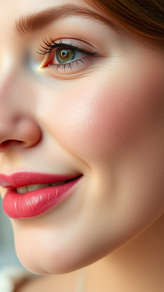 Her nose is delicately small and gently upturned, with a charming button shape. Her lips are plush and vibrant, adorned with a natural rosy tint that beautifully contrasts her alabaster skin. They are slightly parted in a soft, thoughtful smile, as if she is savoring a moment of beauty around her. Shimmering jewelry catches the light, adding a touch of elegance to her appearance.