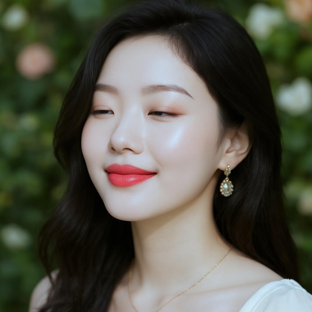 Her nose is petite and delicately upturned, boasting a subtle button-like shape. Her lips are naturally full and rosy, providing a charming contrast to her alabaster skin. They rest gently apart in a soft smile, as if she is entranced by the surrounding beauty or lost in serene contemplation. The scene is enriched with elegant jewelry that highlights her features, creating a harmonious balance.