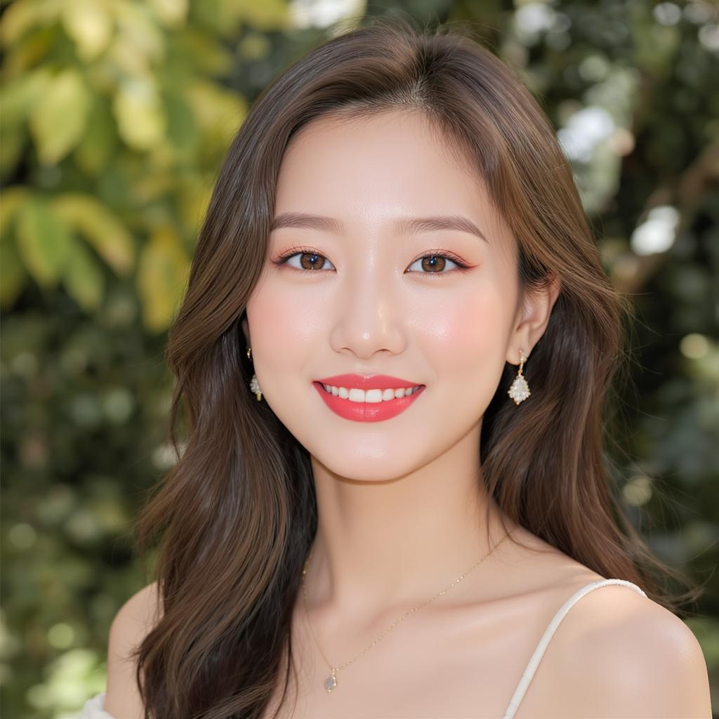 Her nose is petite and gently upturned, with a touch of button-like charm. Her lips are full and lush, naturally tinted with a soft pink hue that beautifully contrasts her porcelain complexion. They are softly parted in a serene smile, as if she is savoring a moment of quiet reflection or taking in the surrounding beauty. Complementary accessories enhance her grace, adding a subtle elegance to her demeanor.